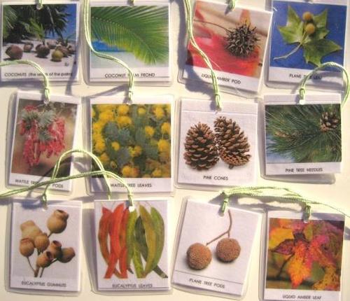 Full 12-card set of LEAVES & SEEDS combines Sets #1 and #2 and includes: coconut palm frond and coconuts; pine needles and cones; plane tree and pod; liquid amber and pod; eucalyptus leaves and gumnuts;and, wattle leaves and pods. These cards are designed to hang from a ‘language tree’ or from hooks or to be placed over dowels and are an extension in language after being introduced to live examples of these plants. In the appropriate season, these cards can be presented along with their objects from nature.