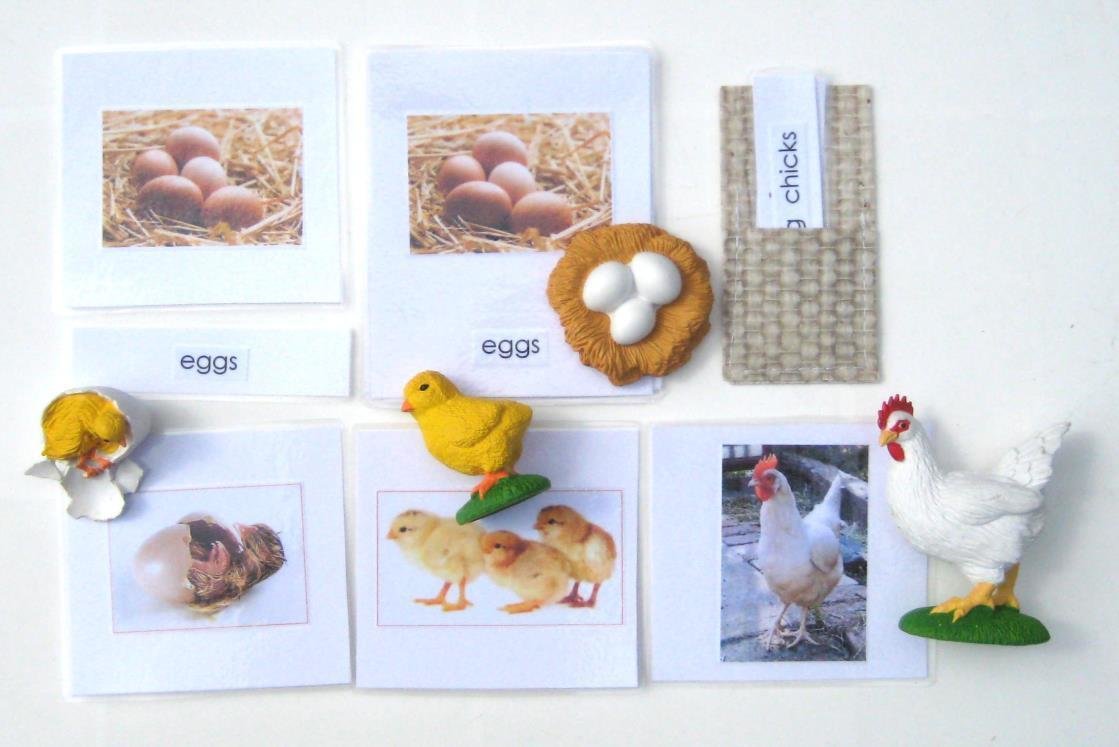 4-piece CHICKEN LIFE CYCLE includes: eggs in nest, hatchling, young chick, adult chicken and matching 3-part cards.