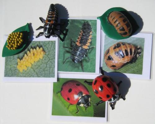 4-piece LADYBIRD BEETLE (‘Ladybug’) LIFE CYCLE & matching cards include: egg, larva, pupa, and adult beetle