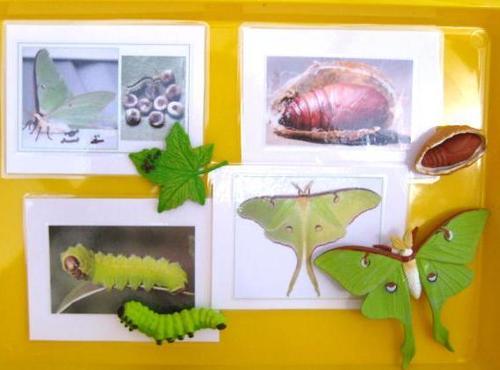 4-piece LUNA MOTH LIFE CYCLE & matching cards include: egg, larva, pupa, and adult moth