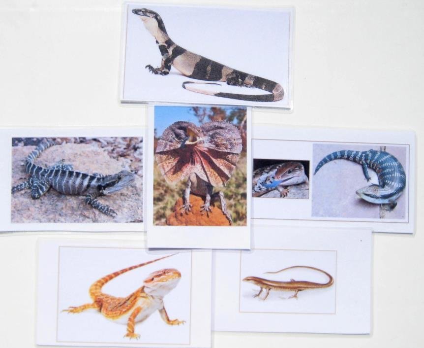 6 AUSTRALIAN LIZARDS cards only include: bearded dragon; bluetongue lizard; eastern water dragon; frilled-neck lizard; garden skink; and, goanna (lace monitor).