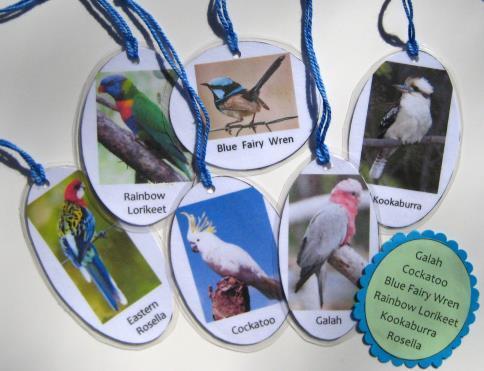 6 BIRDS of AUSTRALIA HANGING CARDS include: sulphur-crested cockatoo; rainbow lorikeet; kookaburra; rosella; blue fairy wren; and a galah.
