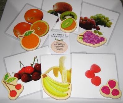 6-card FRUITS, Set #1, with matching magnets include: banana; cherry; raspberry; orange; kiwi; and grapes