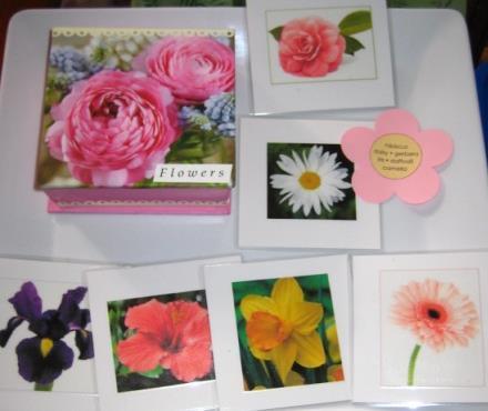Flower Box is a hinged, cardboard box which will hold all 6 cards. There is an insert to raise the level of the cards so that a child may more easily lift each card out.