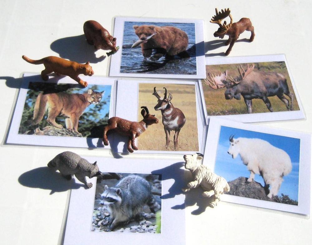 6 NORTH AMERICAN ANIMALS, Set # 1 with matching cards, includes: raccoon, grizzly bear, pronghorn antelope, mountain lion, mountain goat, and moose.