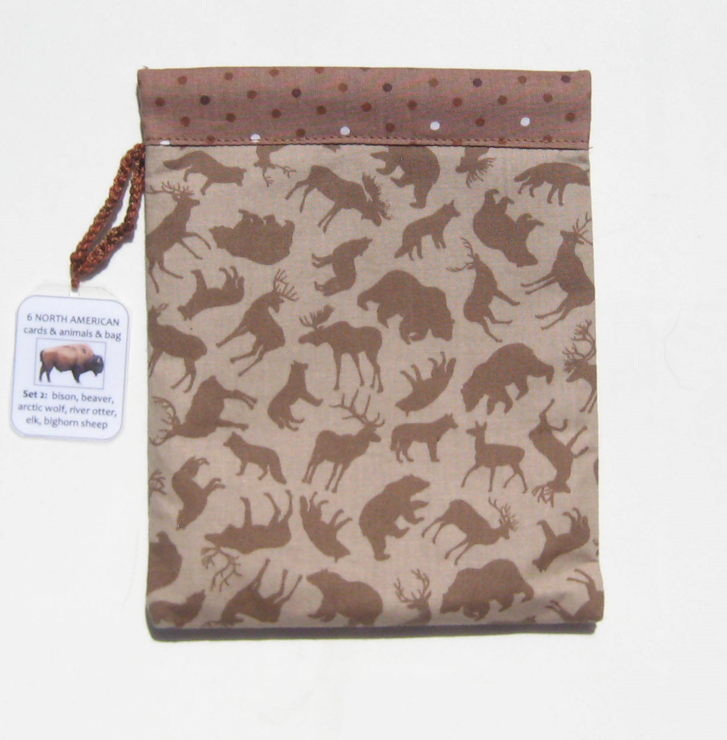 See the Presentation-Storage category on the Home Page to add a fabric pouch themed and sized to fit these animal cards. Cards or pouches may be purchased separately or combined for enticing presentation and helpful storage. The pouch shown here will not only hold the cards but the 6 animals as well.