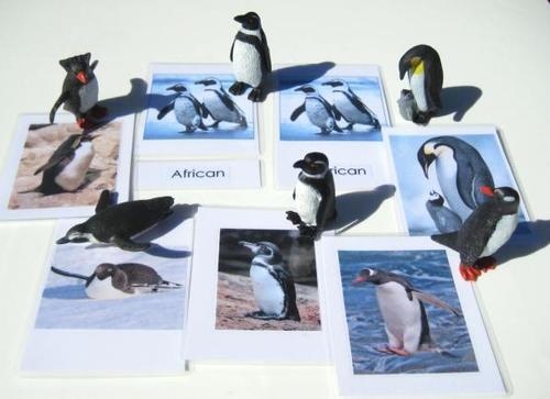 6 PENGUINS & matching 3-part cards – are chosen for you from: adelie, chinstrap, African, gentoo, humboldt, fairy, emperor & chick, emperor chick, Galapagos and/or rockhopper penguins.