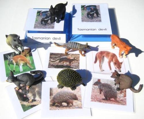 7 AUSSIE ANIMALS & 3-Part Cards, Set #1, include: dingo, echidna, kangaroo, numbat, possum, quokka, and Tasmanian devil.