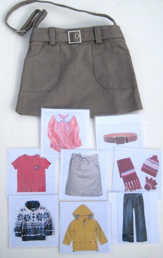 CLOTHES cards include the following 8: skirt, t-shirt, jeans, jumper, belt , blouse, raincoat and scarf, hat and gloves. The cards can be purchased separately as a set or in combination with the skirt zip bag, which stores the cards, offers enticing presentation in the classroom, and is easily carried by the child or hung for display.