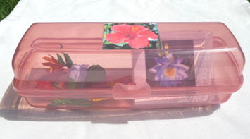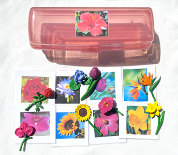 The 8 FLOWERS include the translucent box and matching cards for each of the following objects: rose, daffodil, waterlily, orchid, bird of paradise, sunflower, tulip, and hibiscus. The translucent box is approximately 24cm (9.5″) long x 8cm (3.5″) high x 7.5cm (3″) deep. Cards and objects fit inside easily and are nicely visible to the child even when the box is on a shelf and closed. As always, having variety when presenting language is a plus. This set is catching to the eye of a child and presents a change in manipulation as well. The box is good both for presentation and for storage. Only 4 of this product are currently available.