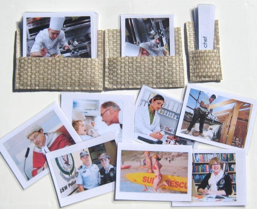 8 OCCUPATIONS, Set #1, in 3-part cards include: chef, surf lifesavers, dentist, police officers, pharmacist, judge, builder and librarian. 24 cards total.