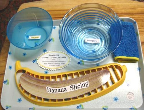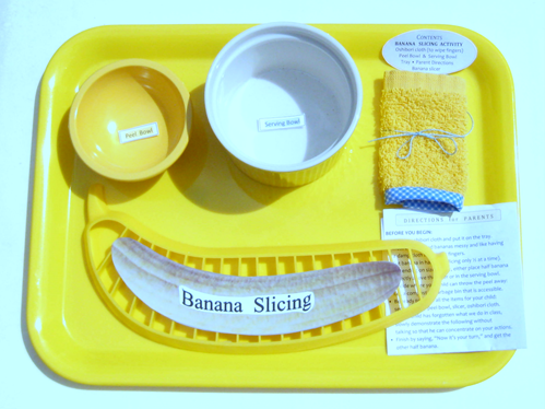 BANANA SLICING ACTIVITY includes: tray or cutting board; peel bowl; serving bowl; oshibori cloth to wipe fingers (dampen before activity); banana slicer; and adult directions in preparation for the child.