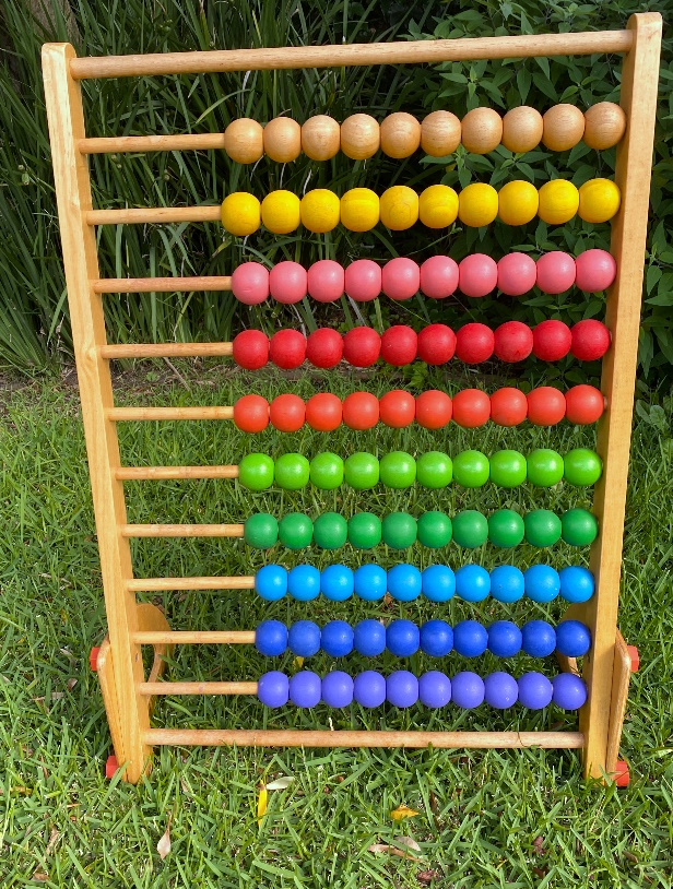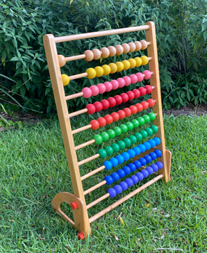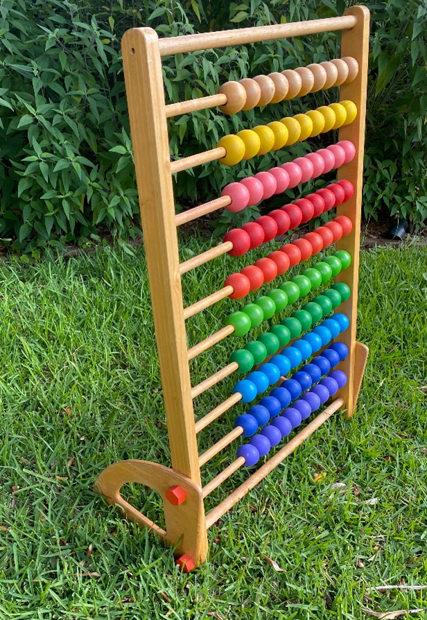 WOODEN BEAD FRAME:  Is 91.5cm (3ft) high x 63cm (25″) wide x 28cm (11″)deep.  There are 10 rows of 100 beads total. Beads have a 5cm (2″) diameter.  The stand is very steady, not tippy.