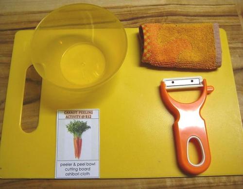 CARROT PEELING ACTIVITY includes: cutting board or tray; peeler; peel bowl; and, oshibori cloth for wiping fingers during food preparation (dampen before activity).