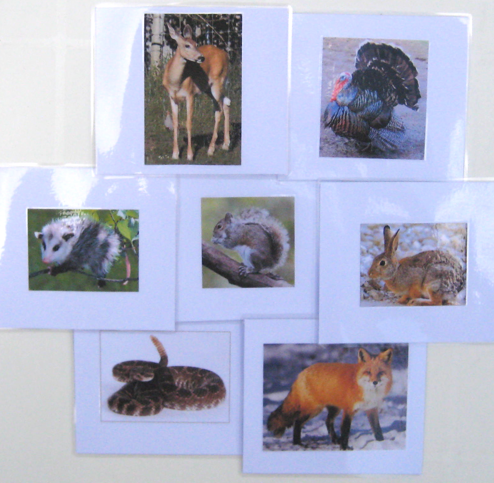 The 7 NORTH AMERICAN ANIMAL cards in Set #1 include: cottontail rabbit; opossum; rattlesnake; red fox; turkey; and, white-tailed deer.