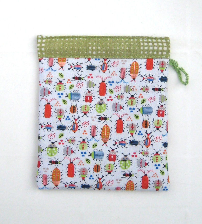 FABRIC SNAP BAG is another enticing change-up for a way to present language materials whether on the shelf or hanging up. It is made to hold cards and/or objects, and is usually themed to match them. Afterwards, the bag provides good safe storage for the same materials. This bag measures 14cm square (5.5″ square), not counting the 2.5cm (1″ band), and can be combined with 6 INSECTS and matching cards of Sets 1 or Set 2 found in our catalogue. Snap bags may be purchased in combination with cards and/or objects offered in Montessori Materials or individually to hold materials you may already have.