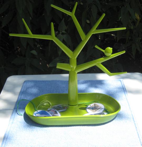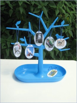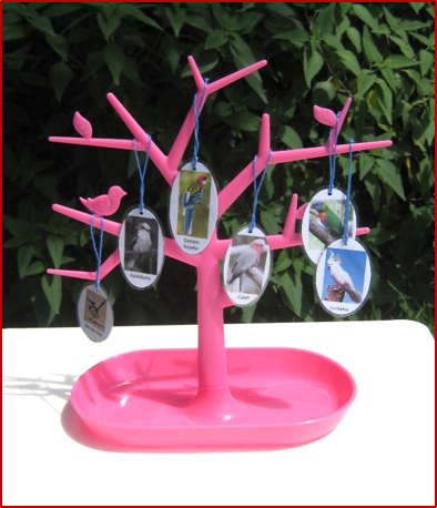 LANGUAGE TREES are approximately 30cm (12″) tall and are used as a language extension after introducing a child to concrete examples (either in nature or with plastic replicas). A child is intrigued by and wants to work with a tree, which offers more manipulation practice and also invites conversation about the inhabitants of trees. The hanging cards made to go in the tree are of plants, birds, animals and insects which can actually be found in a tree. This tree has a good base for holding the cards.