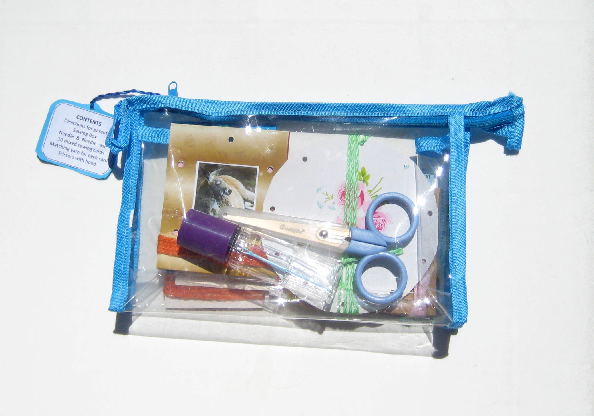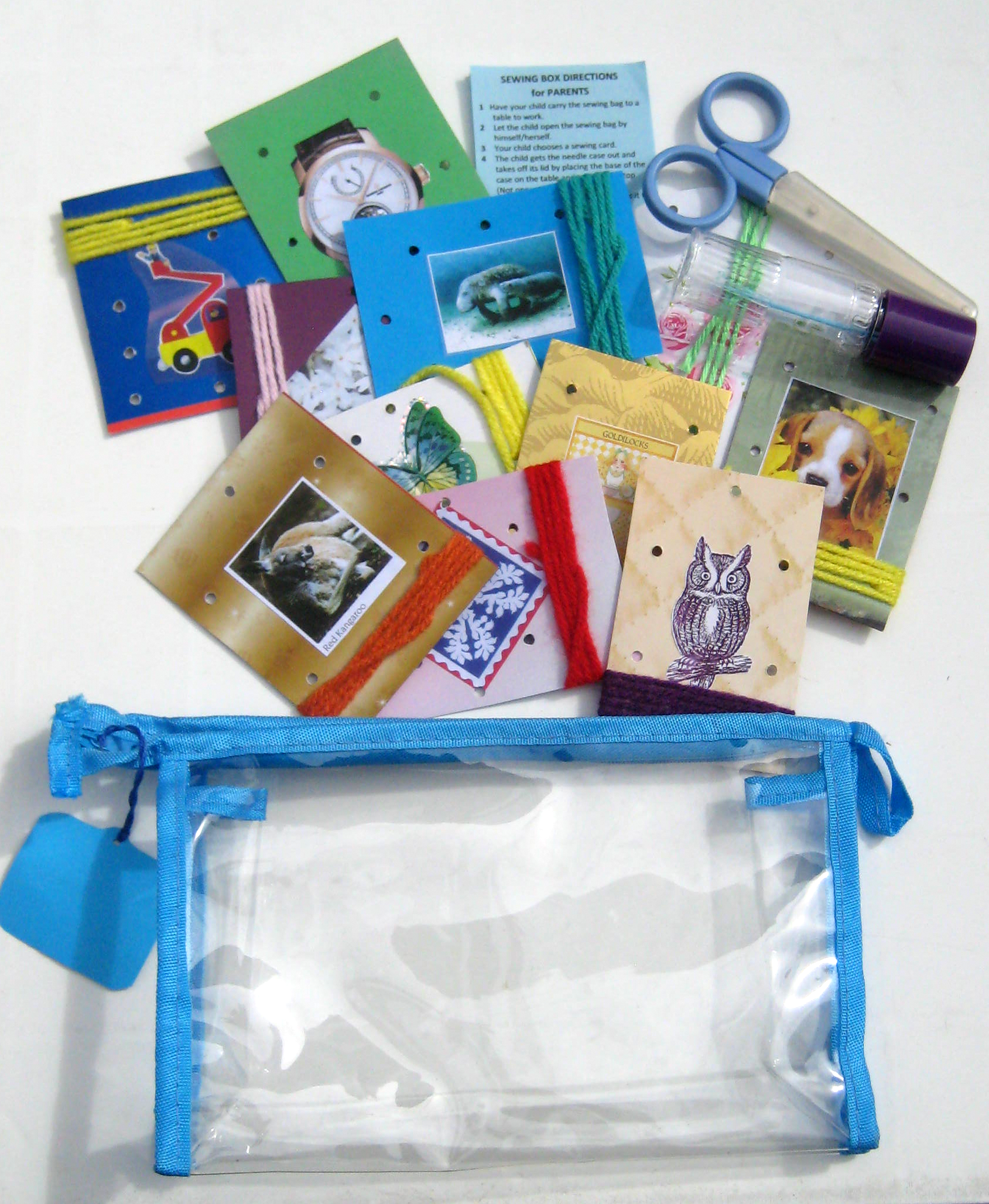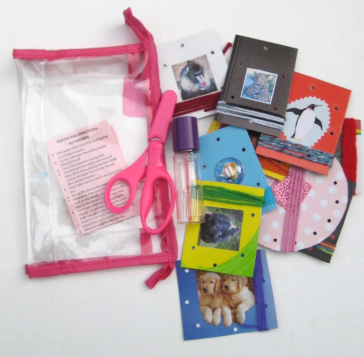 This Sewing Activity includes:  10 sewing cards with matching yarn; plastic needle in screw-top needle case; scissors with safety hood; and, directions for the adult — all in a clear plastic zip bag.  The bag measures 22cm (8.75″) wide by 14cm  (5.5″) high and, its binding is in pink or blue.  Sewing holes are pre-punched in the cards and yarn is attached in readiness for use.  There are a variety of pictures on the cards of subjects which appeal to children.